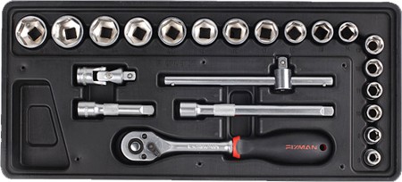 Insert for tool our tool cabinets. 1/3 drawer size, 22 pieces. The set consists of 3/8 inch drive socket wrench, 3/8 inch drive sockets in sizes 8 to 22 mm with accessories.