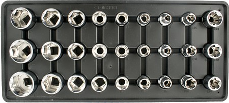 ½ drive sockets in sizes 8 mm to 32 mm and TORX sockets E14 to E24.